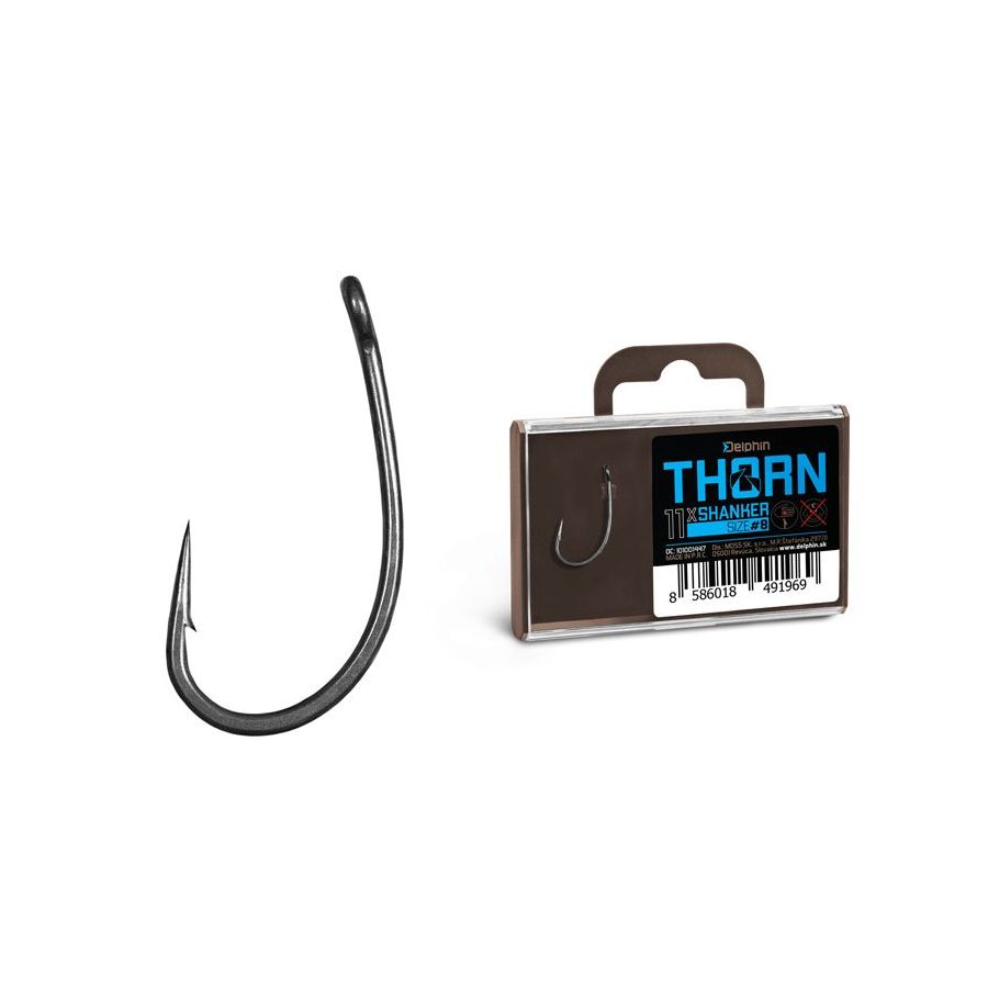 Delphin THORN je prémiová rada kaprárskych háčikov najvyššej kvality. Vďaka moderným technológiám, ktoré boli použité pri výrobe sú tieto háčiky synonymom nekompromisnej pevnosti a maximálnej ostrosti. Háčiky zo série THORN disponujú titanX povrchovou úpravou, čím nadobúdajú matný šedý povrch, ktorý je navyše dokonale hladký pre ľahké preniknutie do kaprej tlamy. TitanX sa stará taktiež o spevnenie a odolnosť celého háčika.