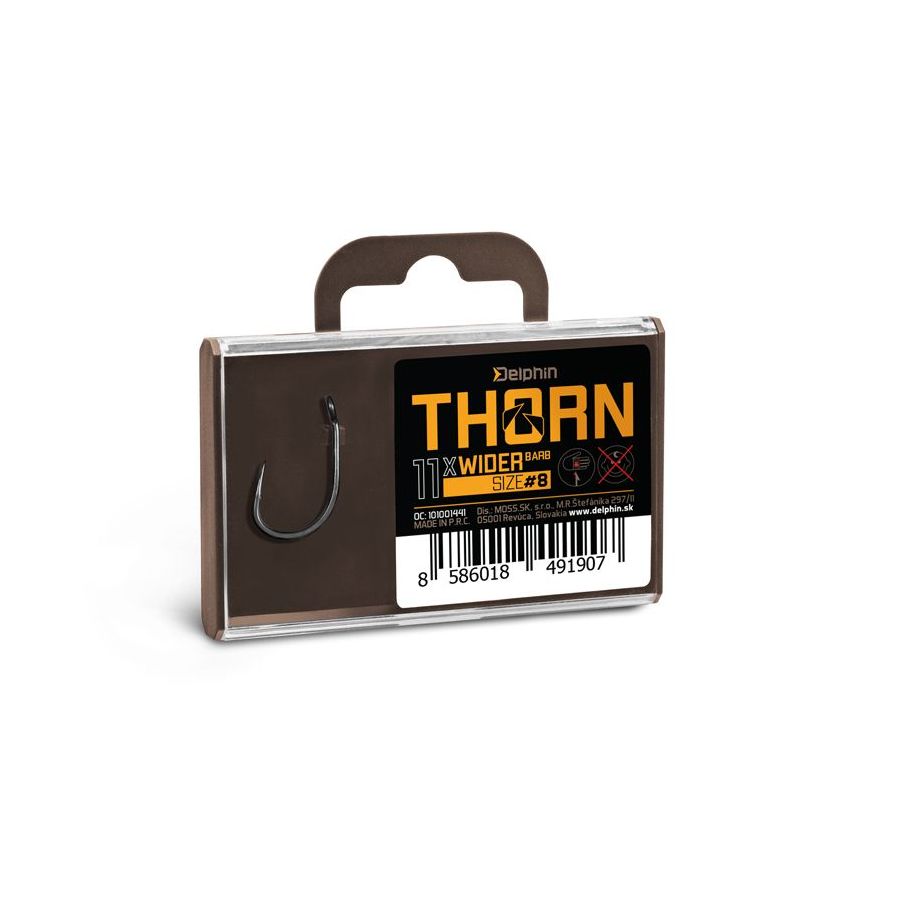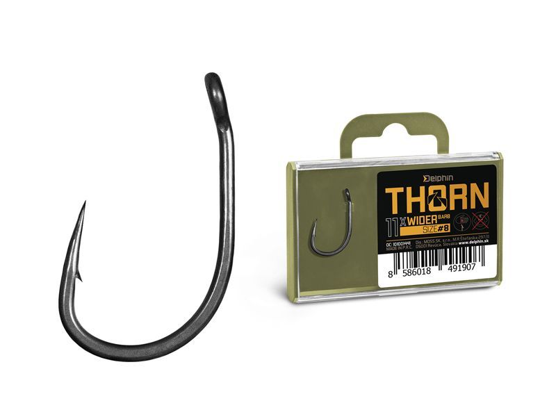 Delphin THORN je prémiová rada kaprárskych háčikov najvyššej kvality. Vďaka moderným technológiám, ktoré boli použité pri výrobe sú tieto háčiky synonymom nekompromisnej pevnosti a maximálnej ostrosti. Háčiky zo série THORN disponujú titanX povrchovou úpravou, čím nadobúdajú matný šedý povrch, ktorý je navyše dokonale hladký pre ľahké preniknutie do kaprej tlamy. TitanX sa stará taktiež o spevnenie a odolnosť celého háčika.