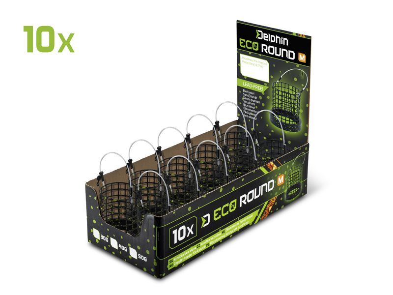 Samotný košík je vyhotovený z pevného drôtu, ktorý spoľahlivo odoláva náročným podmienkam a mechanickému poškodeniu. Valcovitý tvar zabezpečuje rýchle uvoľnenie kŕmnej zmesi ihneď po dopade na dno. Oproti klasickým krmítkam na ďaleké hody so slzou na spodku ponúka model ECO ROUND rýchlejší rozpad objemnejších častí krmiva. Stačí naplniť hrubú zmes, zaistiť ju z oboch strán sypkým kŕmením a po dopade na dno krmítko jemne potiahnuť.