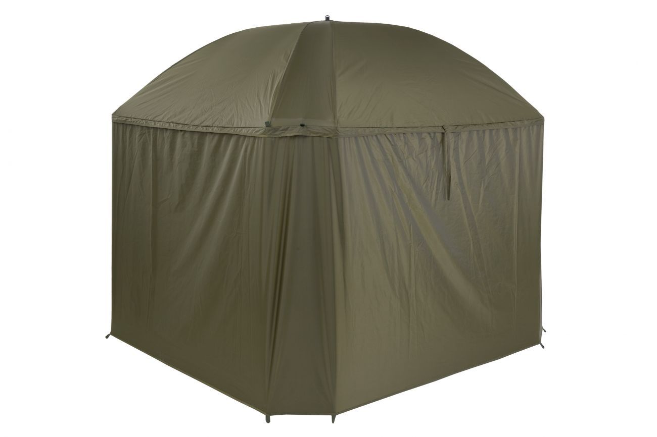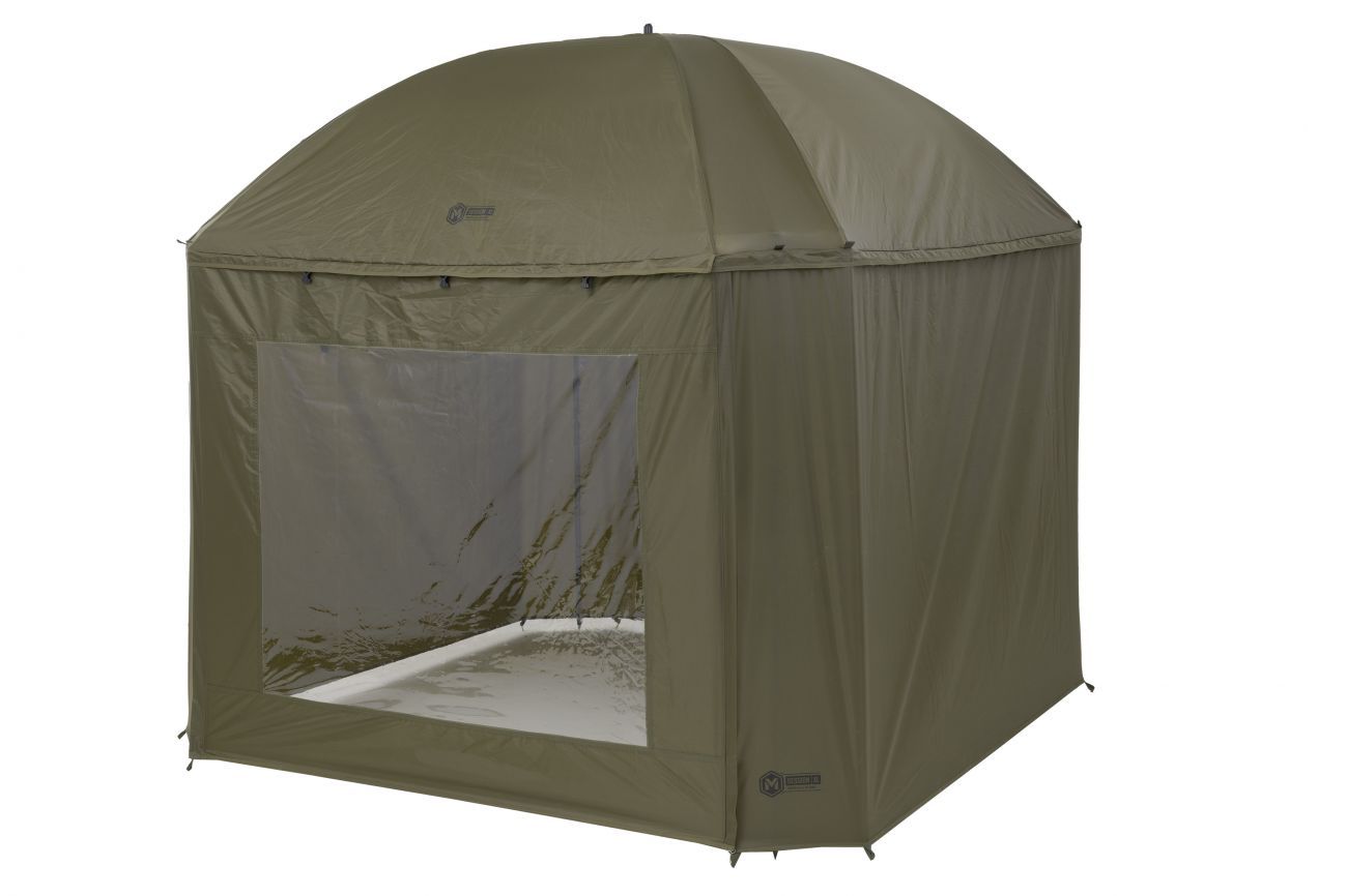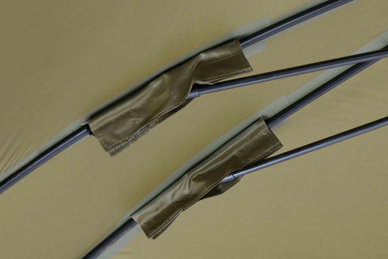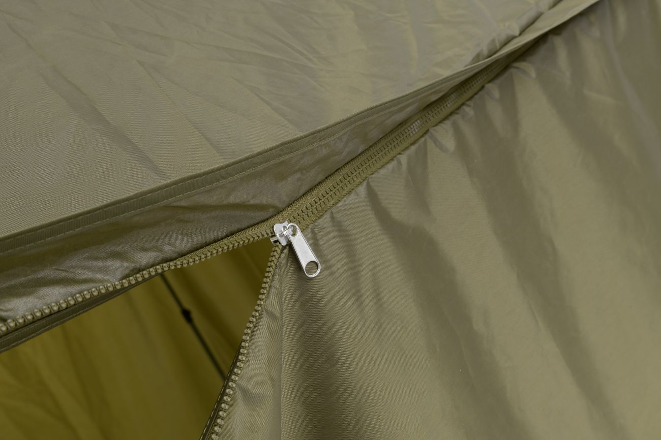 Kompletne zakrytý dáždnik štvorcového tvaru s obrími rozmermi. Možno do neho umiestniť dve veľké rybárske lehátka. Rozmerom dáždnika je plne prispôsobená jeho konštrukcia a použité materiály. Kostra je vyrobená z pevných a pružných laminátových rebier, ktoré okrem vysokej tuhosti a stability zaisťujú aj veľkú odolnosť. Tú oceníte najmä pri silnom vetre, kedy by štandardné drôtené rebrá boli zdeformované alebo úplne zničené. Kvalitný nylonový plášť ponúka veľmi nízku hmotnosť, nekompromisný vodný stĺpec 8000mm a kompletne podlepené švy. Bočnica je po celom obvode pripevnená robustným zipsom, krytým odkvapničkou. Predný panel s rozmerným oknom je možné ľahko rozopnúť a zrolovať nahor. Vo veternom počasí je možné dáždnik stabilizovať pomocou štyroch kotviacich laniek. Súčasťou dodávky je aj sada plnohodnotných bivakových kolíkov pre perfektné ukotvenie aj v náročných podmienkach. Skvelým doplnkom tohto dáždnika je unikátna stabilizačná sada do extrémnych podmienok dodávaná samostatne.