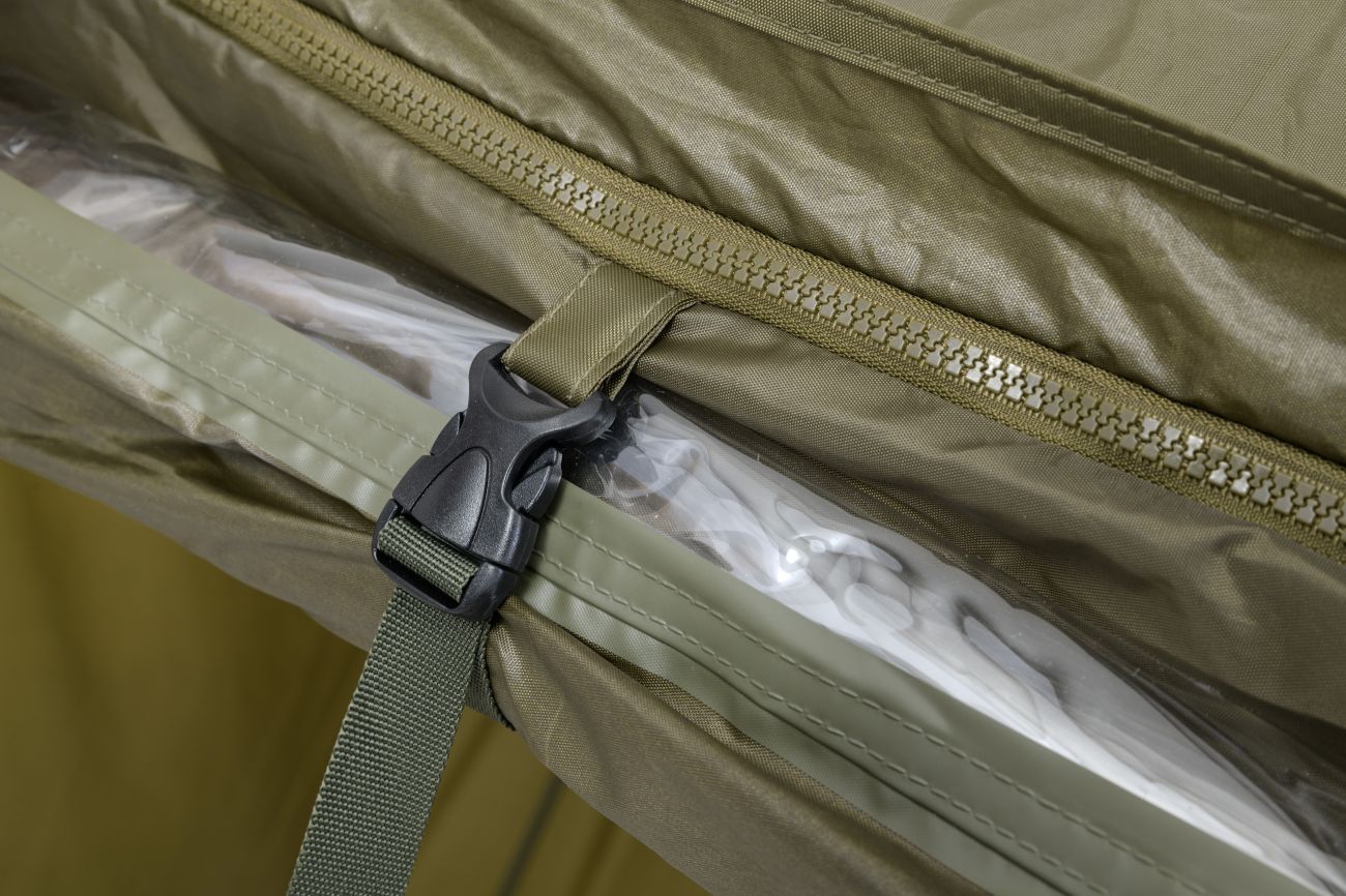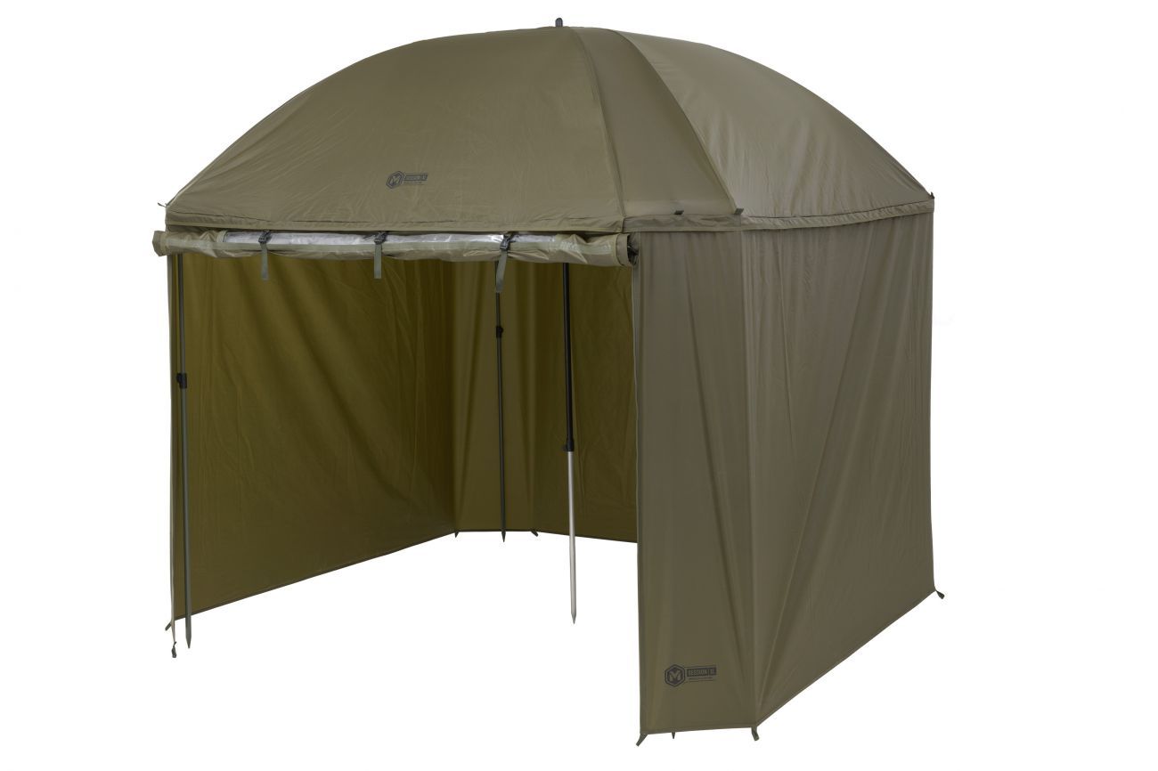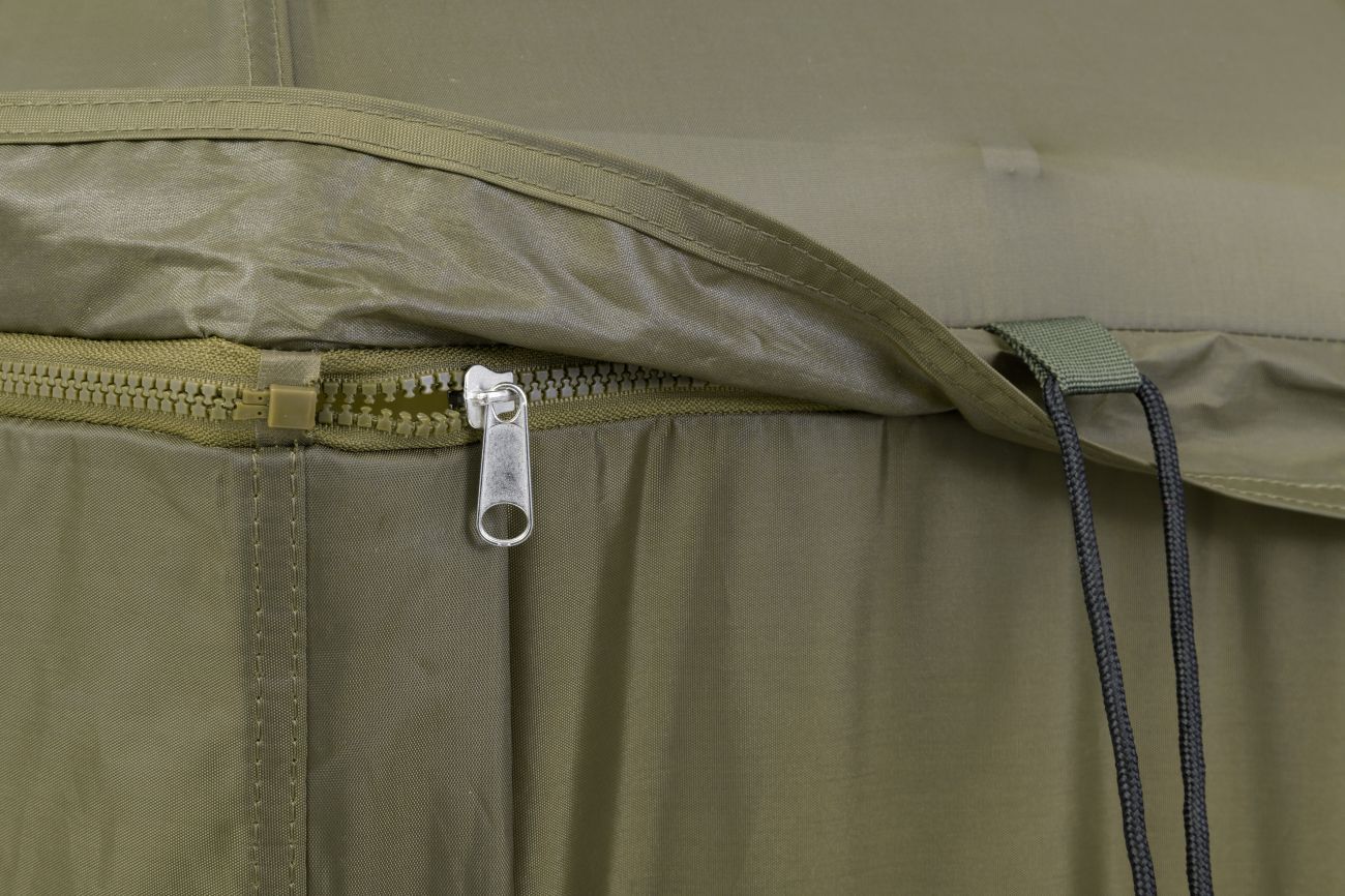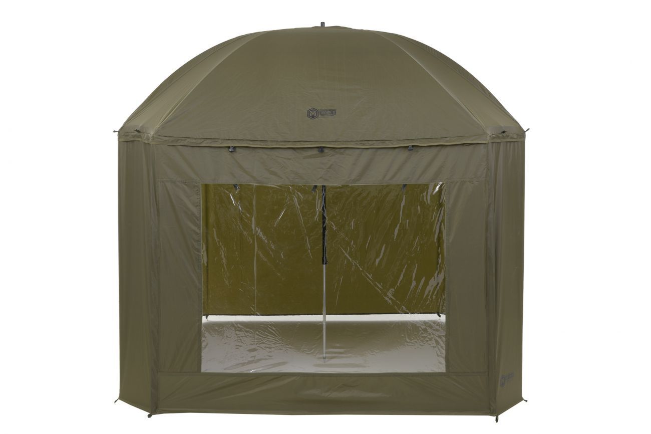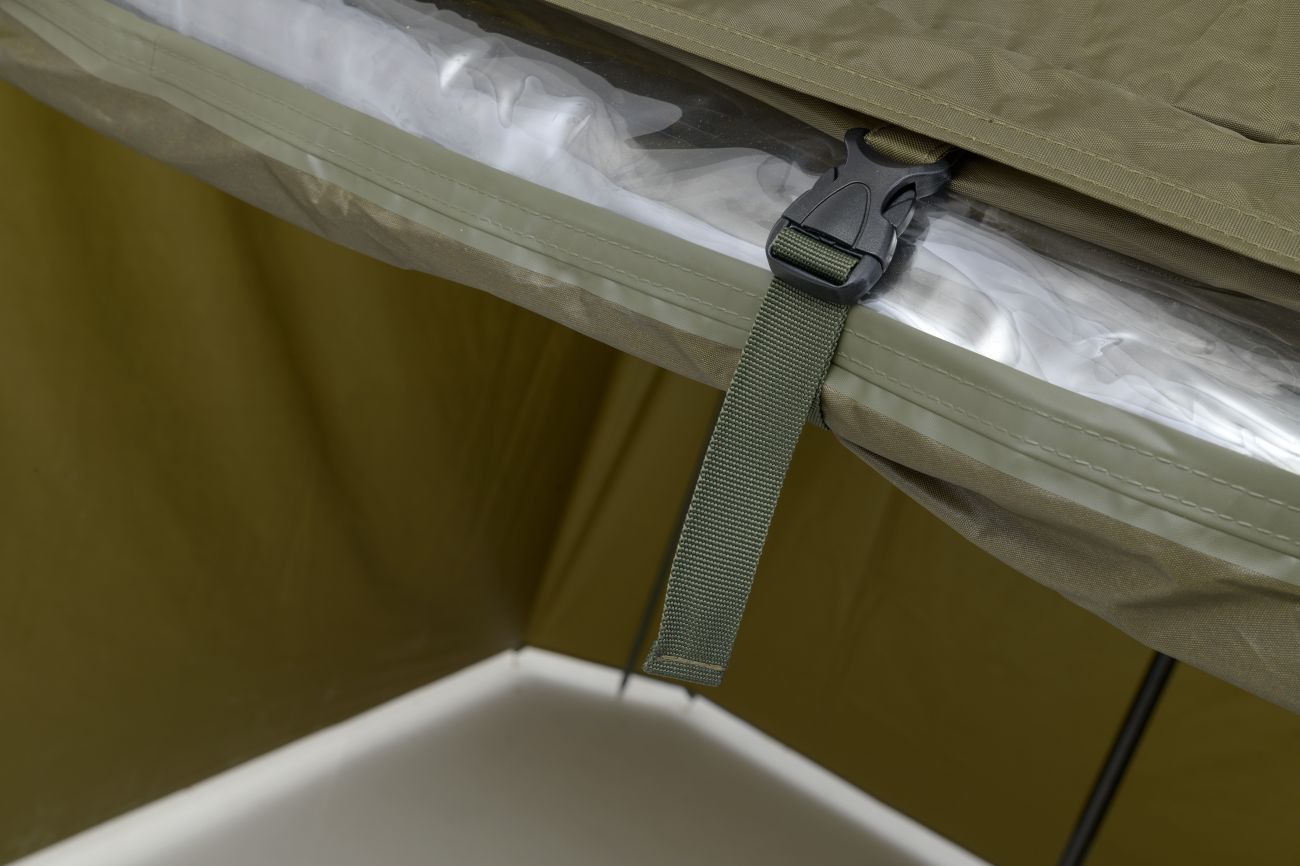 Kompletne zakrytý dáždnik štvorcového tvaru s obrími rozmermi. Možno do neho umiestniť dve veľké rybárske lehátka. Rozmerom dáždnika je plne prispôsobená jeho konštrukcia a použité materiály. Kostra je vyrobená z pevných a pružných laminátových rebier, ktoré okrem vysokej tuhosti a stability zaisťujú aj veľkú odolnosť. Tú oceníte najmä pri silnom vetre, kedy by štandardné drôtené rebrá boli zdeformované alebo úplne zničené. Kvalitný nylonový plášť ponúka veľmi nízku hmotnosť, nekompromisný vodný stĺpec 8000mm a kompletne podlepené švy. Bočnica je po celom obvode pripevnená robustným zipsom, krytým odkvapničkou. Predný panel s rozmerným oknom je možné ľahko rozopnúť a zrolovať nahor. Vo veternom počasí je možné dáždnik stabilizovať pomocou štyroch kotviacich laniek. Súčasťou dodávky je aj sada plnohodnotných bivakových kolíkov pre perfektné ukotvenie aj v náročných podmienkach. Skvelým doplnkom tohto dáždnika je unikátna stabilizačná sada do extrémnych podmienok dodávaná samostatne.