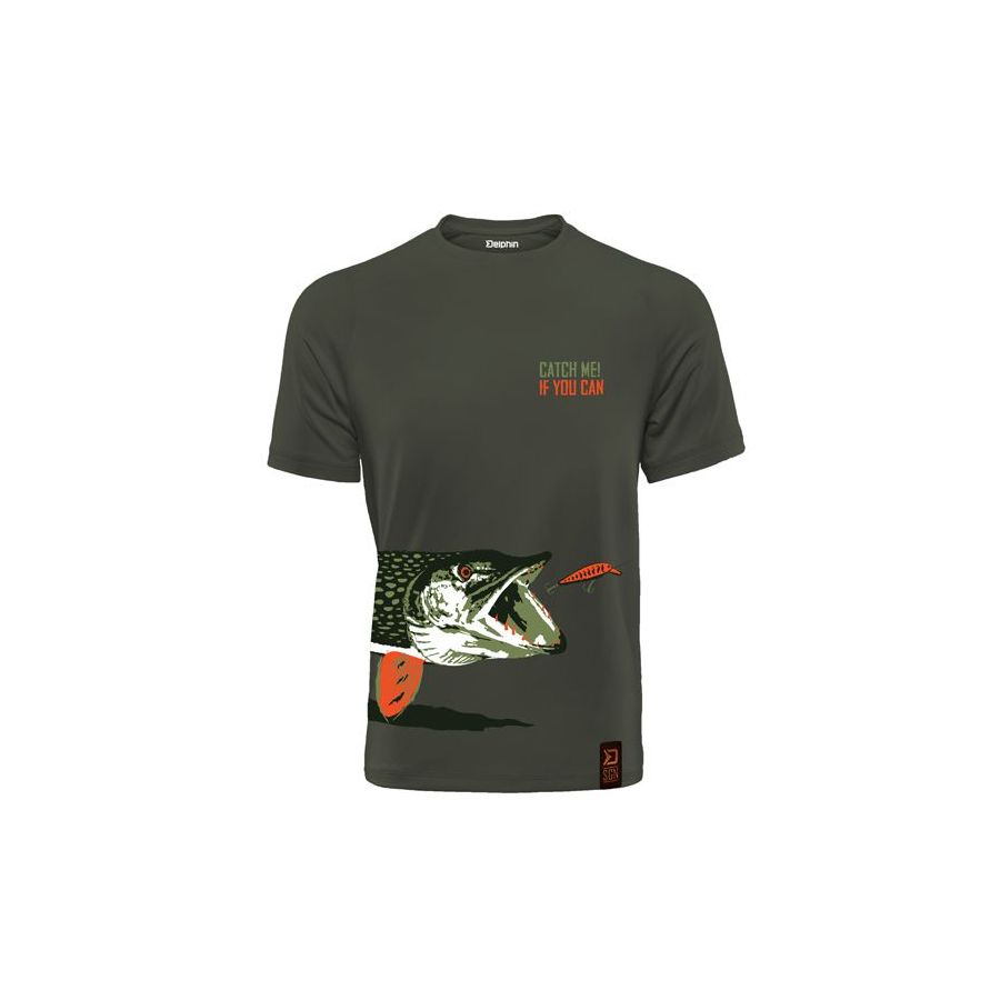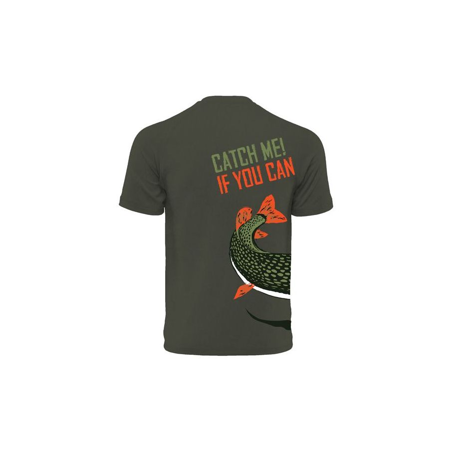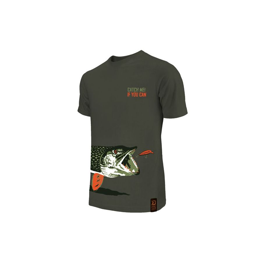 Tričko Catch me! ŠŤUKA je dizajnované v tmavo zelenej farbe s vyobrazením šťuky, ktorá sa práve blíži k nástrahe, čo je moment, na ktorý čakajú všetci priaznivci lovu týchto rýb.